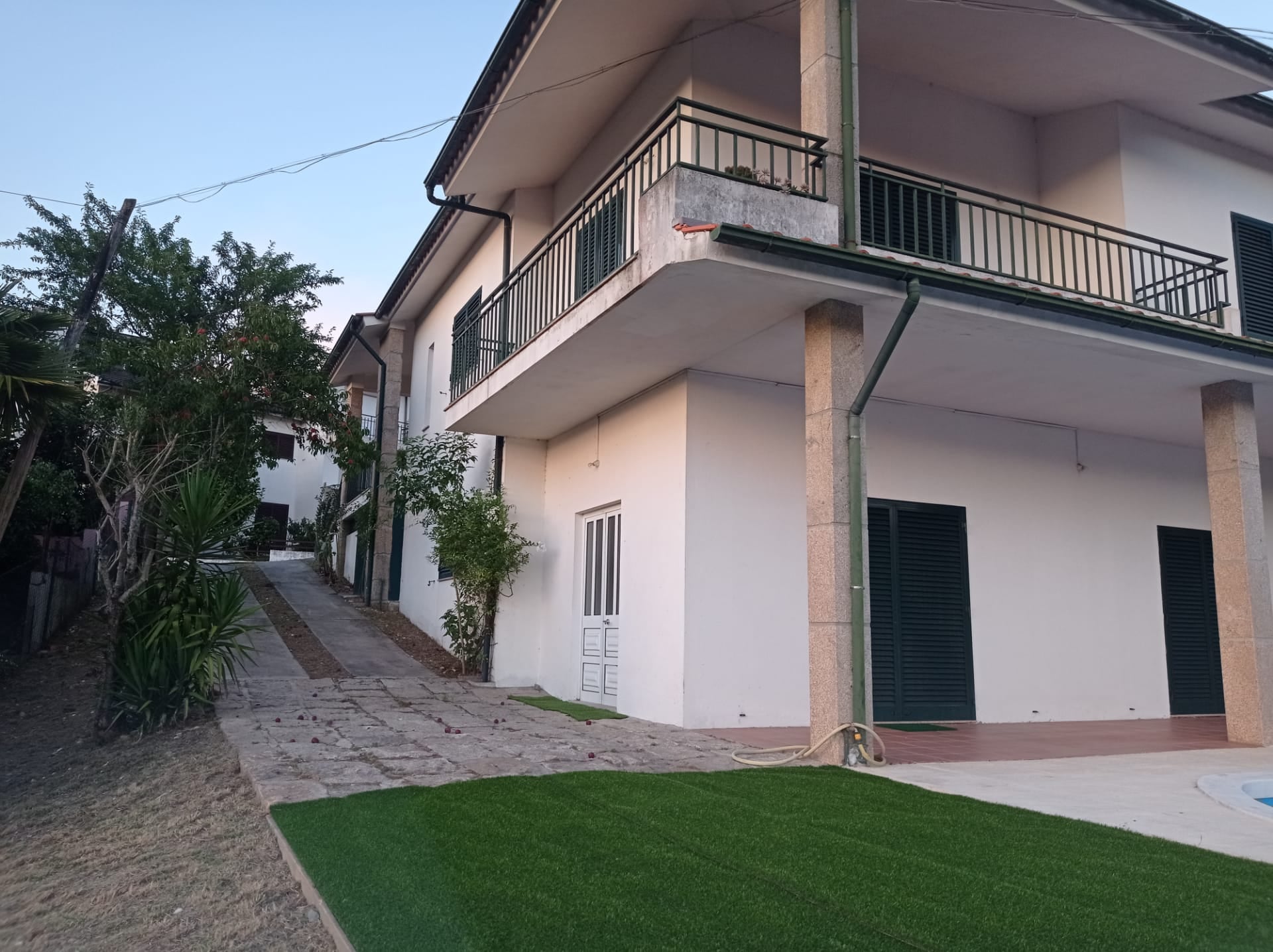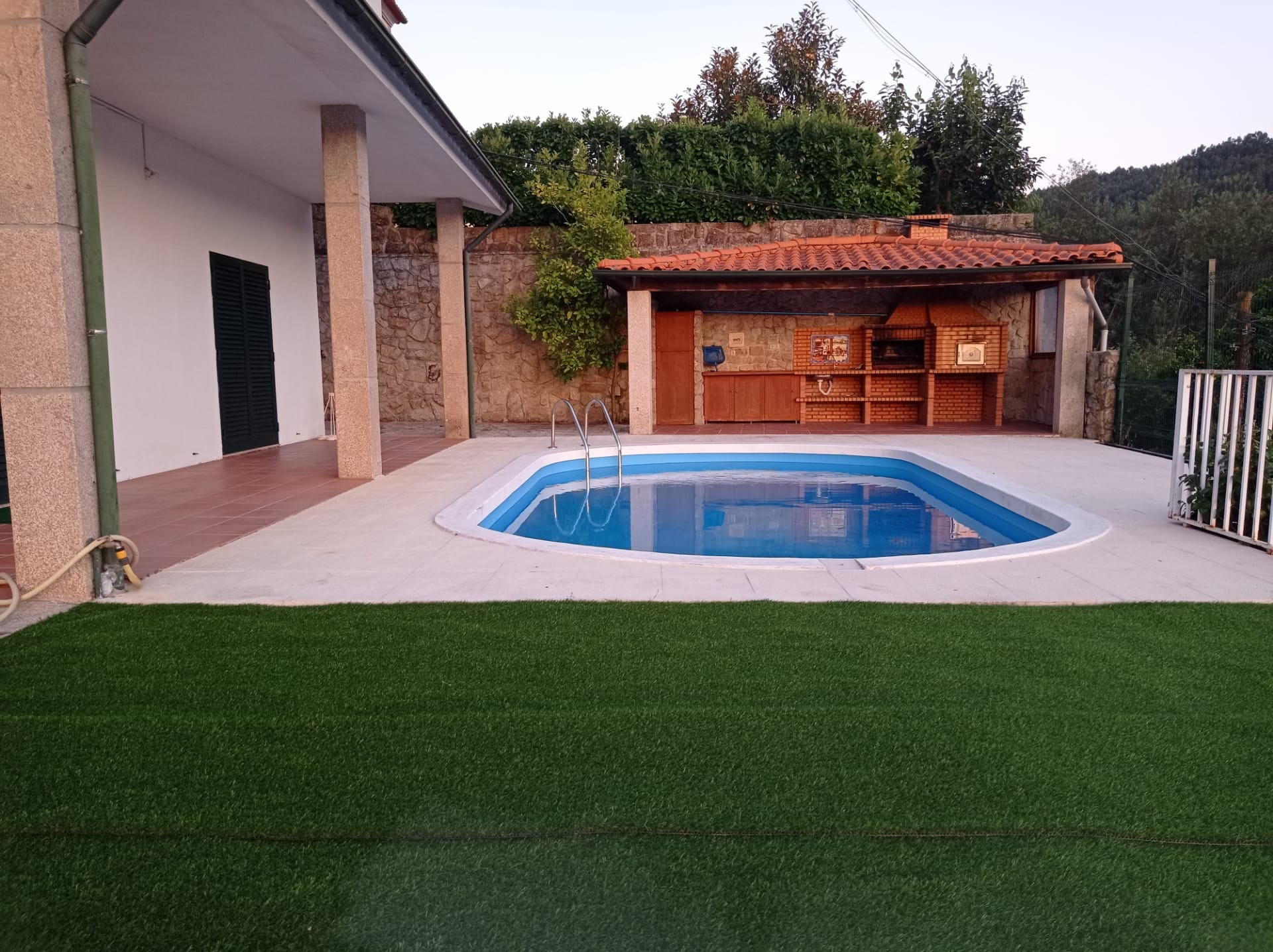 Composta por 3 quartos todos com casa de banho privativa, sala de estar com sofá cama, cozinha equipada, salão com cerca de 150m2 e amplo, churrasqueira e piscina apenas para uso da moradia.